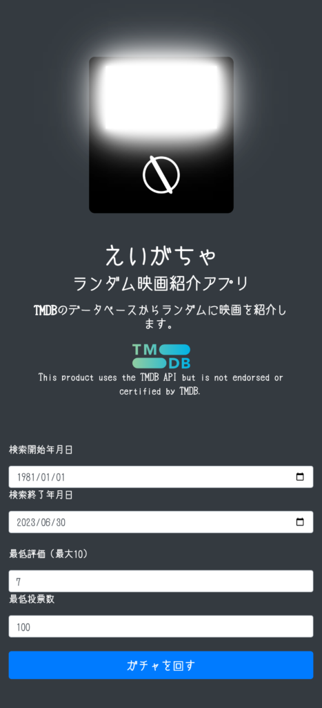 この「えいがちゃ」というアプリは、TMDbというデータベースからランダムに映画を出力することができます。