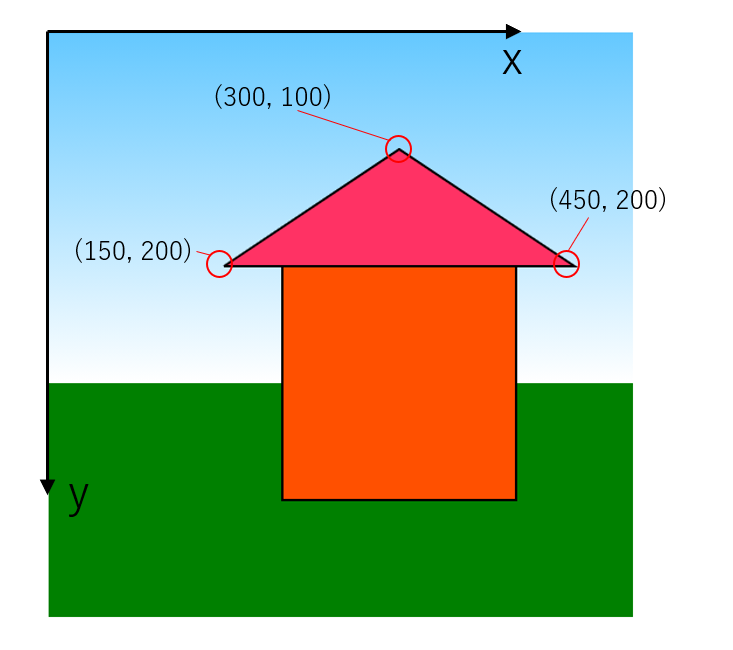 今回は屋根の左下(150,200)、屋根の右下(450,200)、屋根のてっぺん(300,100)へ線分を走らせ、最後にスタート地点の屋根の左下(150,200)に戻ってくるようになっています。
