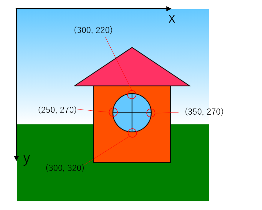 最後に円のパスを描くarc()を使って窓を描きましょう。