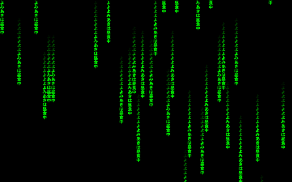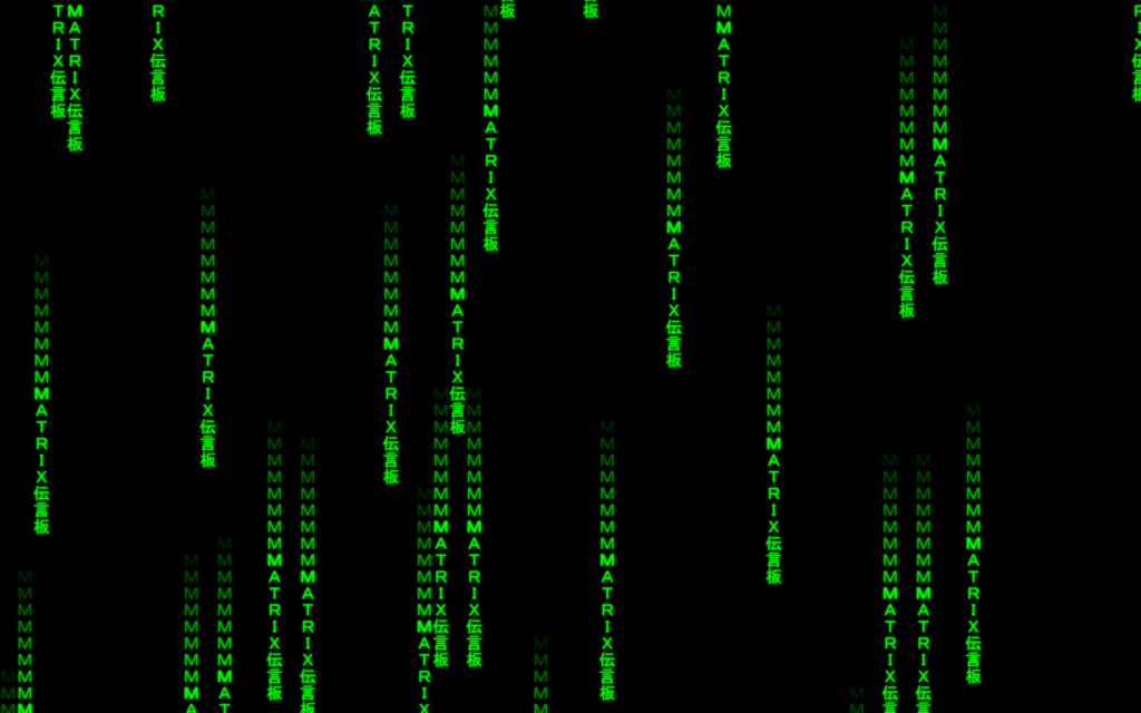 この前、映画「Matrix」のあの緑色の文字が雨のように流れていく画面(Matrix Code Rainっていうんかな?)をHTMLのCanvasで作りました。